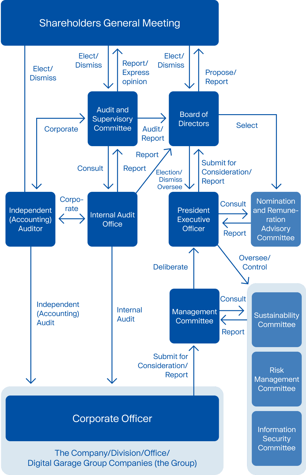 The Board of Directors shall oversee the Group by the business classification, and the Corporate Division supervises and grasps overall situation of compliance in the Group by the business classification. Both Directors of the Board and the Corporate Division periodically report such status and activities to the Board of Directors and Audit and Supervisory Committee.