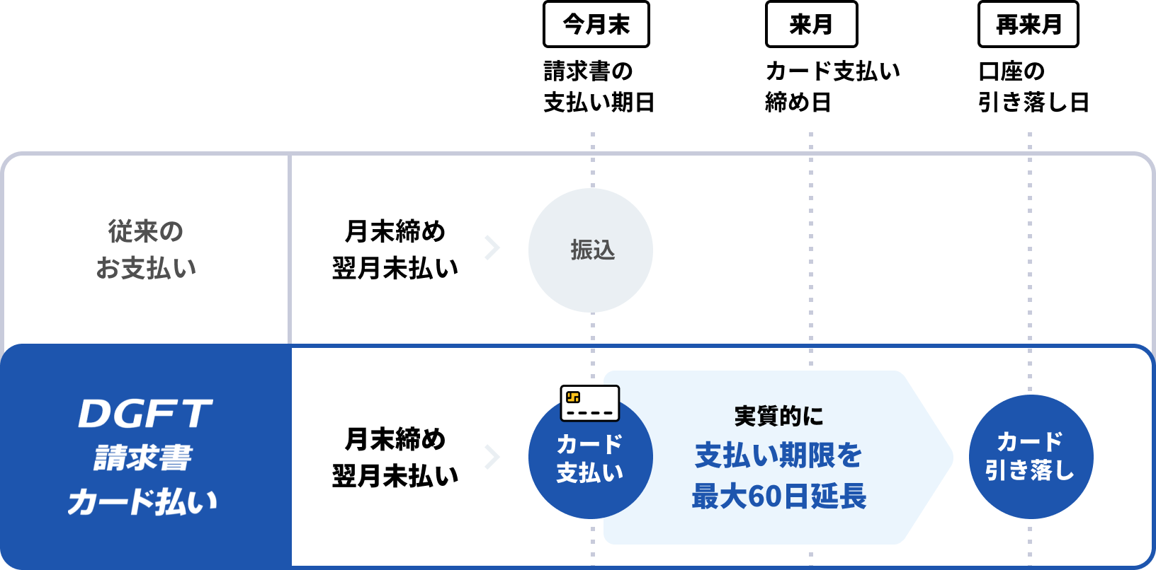 銀行振込の請求書をクレジットカードでの支払いに切り替えることで、実質的な支払い期日を繰延できるB2B決済サービスです。銀行振込の支払いを、JCB/Visa/Mastercard®/ダイナースクラブのカード(JCBブランドで発行されたプリペイドカードを除く)での支払いに切り替えることで、実質的な支払い期日を最大60日程度繰延するサービスです。取引先がカード決済に対応していない場合でも利用できます。季節要因による定期的な資金不足や突発的な資金調達など、中小事業者の資金繰りをサポートしています。