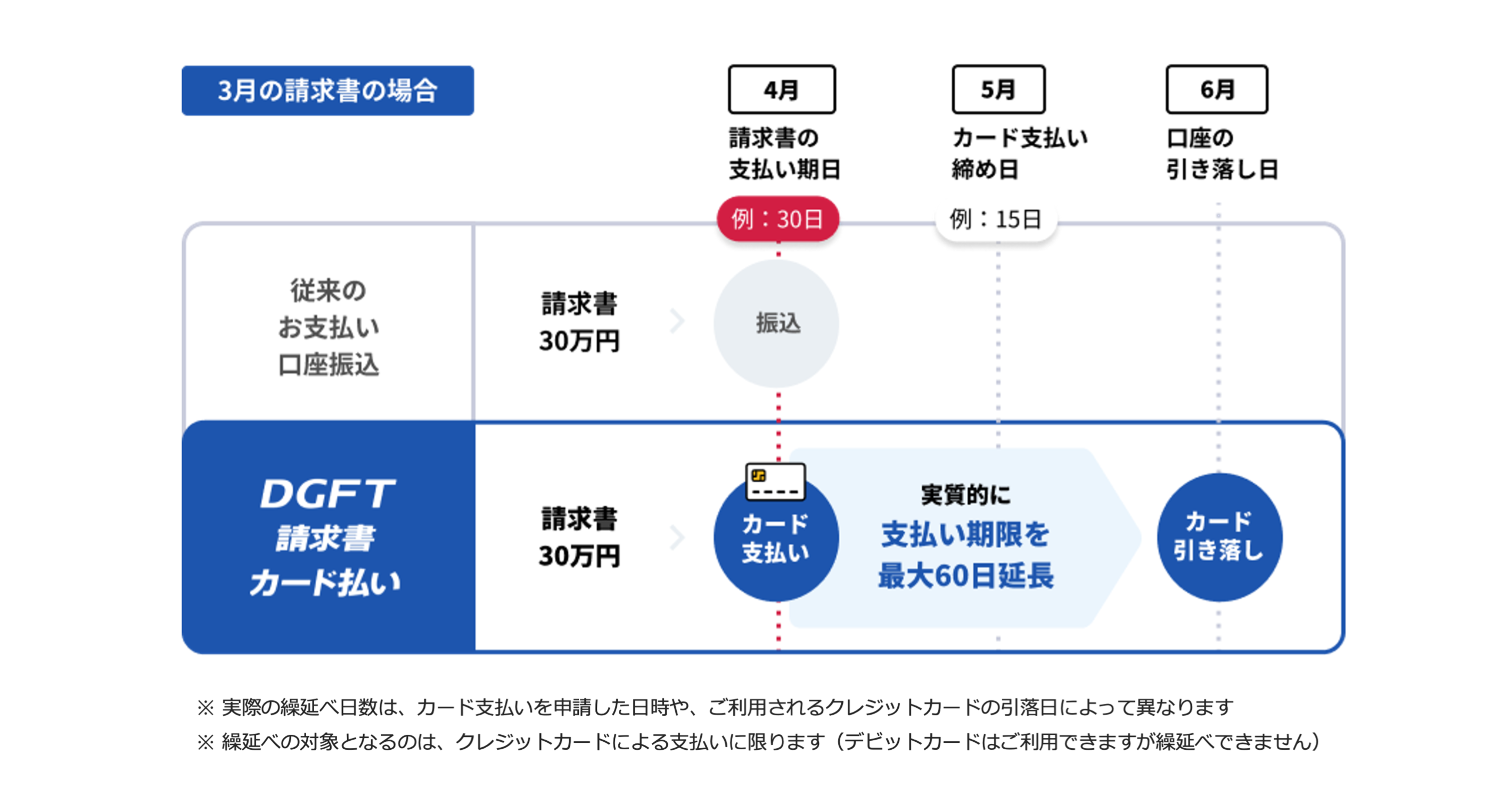 「DGFT請求書カード払い」は、銀行振込の請求書をクレジットカードで支払えるサービスです。本サービスを利用することで、事業者は実質的な支払いサイトを最大60日程度繰り延べることが可能となり、キャッシュフローの改善を実現します。また、支払い先(請求書の発行元)がカード決済に対応している必要はなく、オンラインで簡単な手続きのみで利用開始できるため、接客や施術の合間など、多忙な店舗運営の合間でも手続きが可能で、業務効率化にも繋がります。
