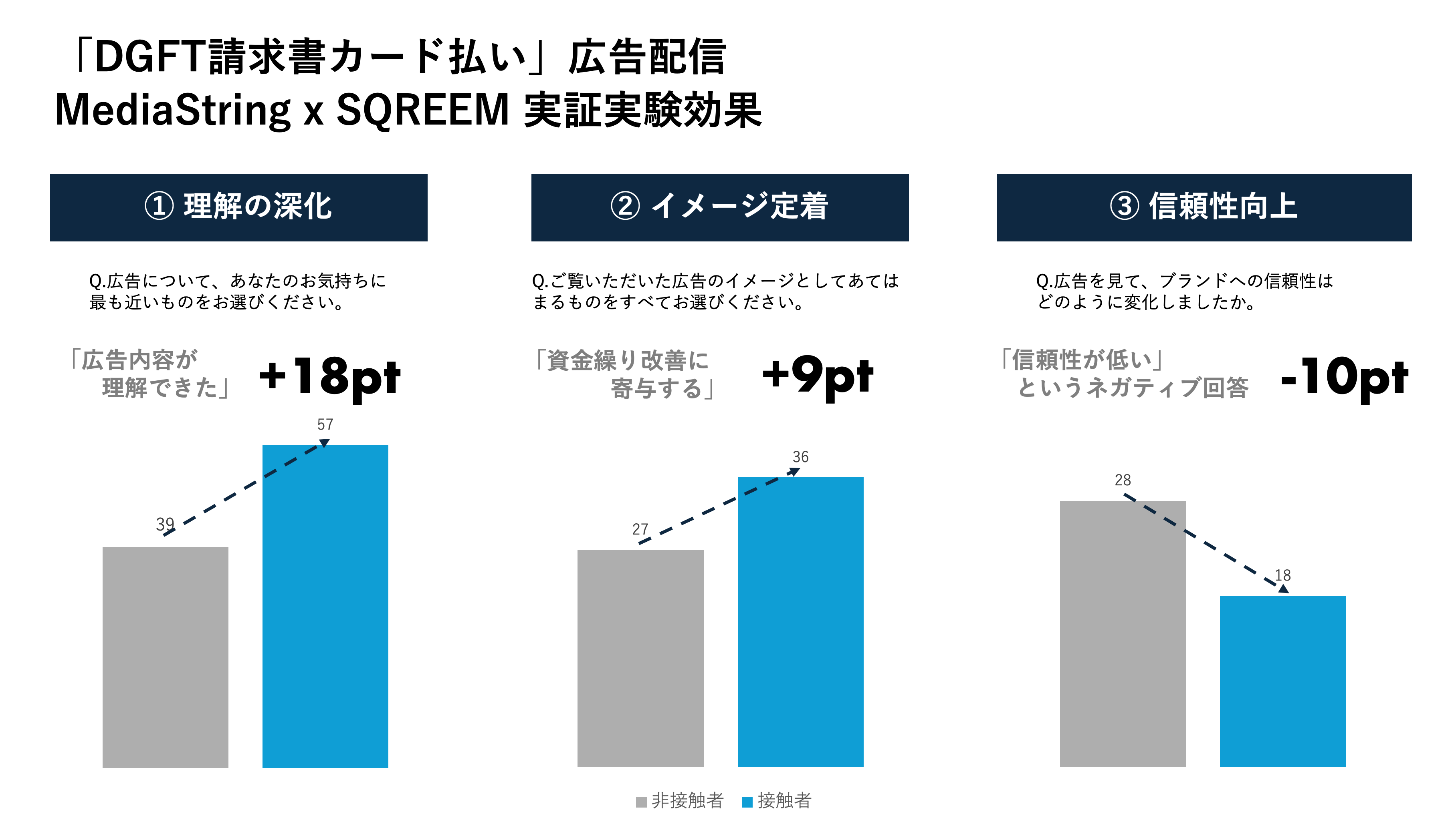 このたび実施した「DGFT請求書カード払い」における広告配信実証では、AIを活用した潜在層分析により、精度の高いユーザー層抽出を実現。ターゲットに合致したブランド力の高い媒体へ掲載することで、新たなユーザー層の流入という成果を確認いたしました。